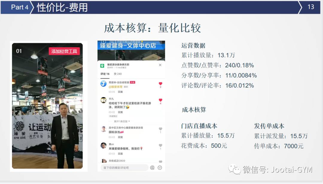 此外也向大家展示了短视频平台的运营推广模式和对应的宣传成本核算。让健身门店从业者更能清晰的认识到IT管理在门店运营中所扮演的角色,以及门店未来的营销推广方向。