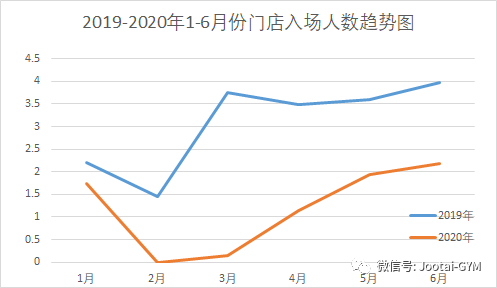 统计数据显示,2020年2月份门店入场人数呈断崖式下跌,2月过后,门店入场人数同比2019年增长缓慢。直至6月份,门店的客流量恢复趋势才较为稳定,但和2019年相比,仍有极大差距。